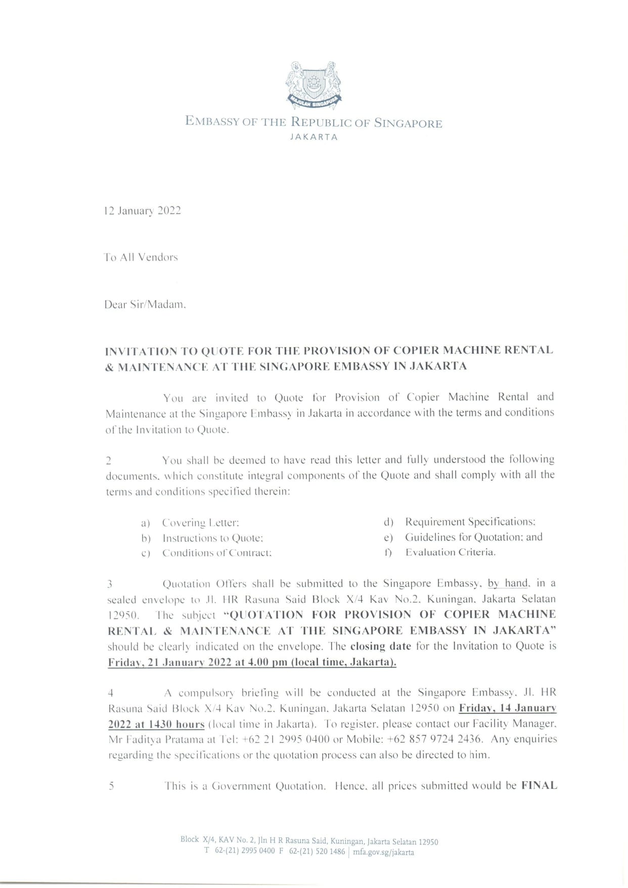 INVITATION TO QUOTE FOR THE PROVISION OF COPIER MACHINE RENTAL AND MAINTENANCE AT THE SINGAPORE EMBASSY IN JAKARTA